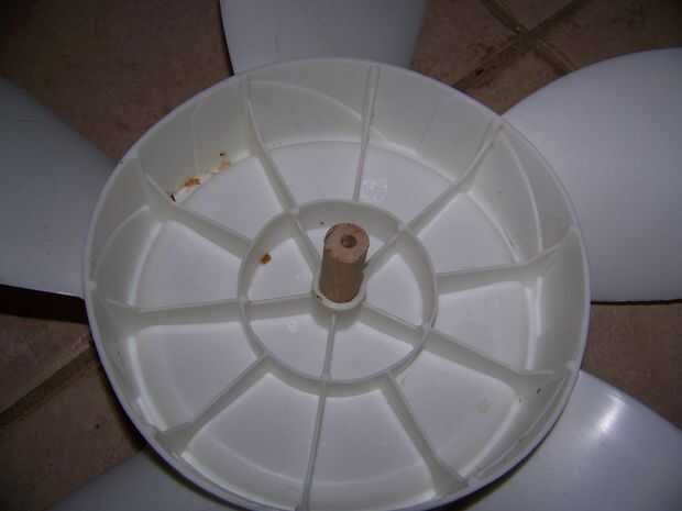 En el sentido de mantener el diseño simple quería tener un rotor simple. Mi solución fue tirar de la cuchilla de una caja barata del ventilador que había llegado al final de su vida. El rotor había sido unido al ventilador en un eje de 1/2 pulgada. Para acomodar el eje de 5mm en mi motor paso a paso, pulse equipada un taco de media pulgada en el ventilador y luego aburrido vio un agujero de 7/32nds a través del pasador y dividir el final de la espiga con una maquinilla de afeitar para permitir el uso de una abrazadera para fijar el ventilador al eje del motor.