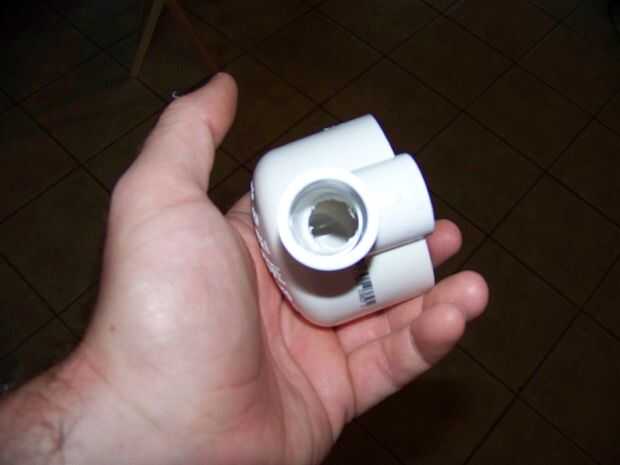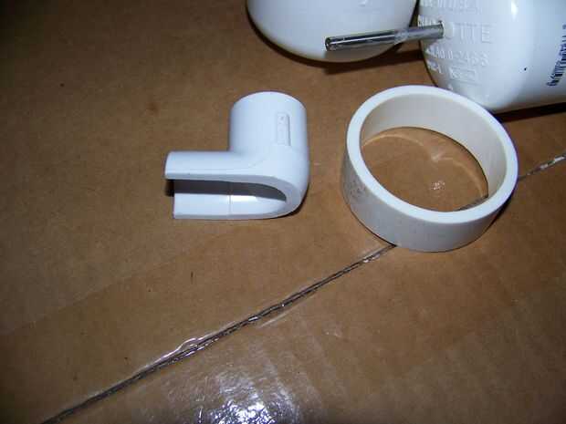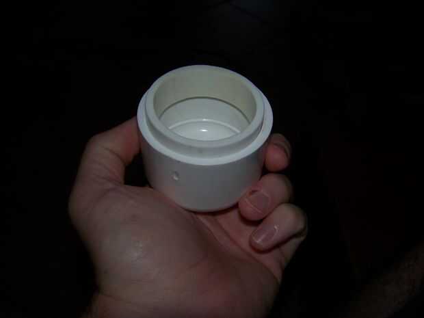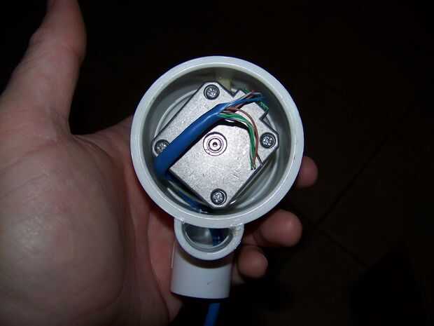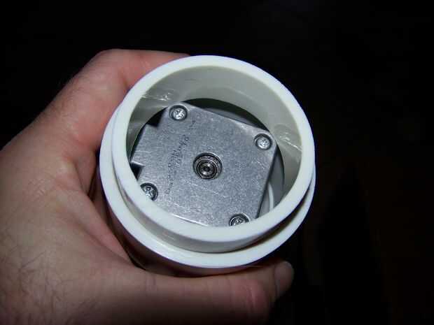La caja y el Monte están hechos de PVC, la cubierta se hace de dos 2" casquillos de extremo, un anillo de 2" para alinear las tapas y mantenga el motor en su lugar y un codo de 1/2" corte hacia abajo para acoplar la caja a la montura. Las dos tapas se llevan a cabo con cinta de aluminio.