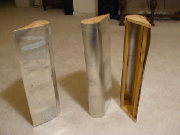 Mi rollo de destellar era 6 pulgadas de ancho. Descubrí que si corté dos piezas de 6 "x 21", podría cubrir el borde de ataque y la parte posterior de cada ala. He podido colocar una pieza de destellar de una costilla a otra en el borde de ataque. Había anclado cada pieza con unos tornillos de metal. Algunos de estos fueron en las costillas y otros en el borde de la pieza de extremo de madera contrachapada. A continuación os adjunto la segunda pieza de flasheo a la parte posterior del ala, se atornillan en las costillas espaldas. Esta pieza de destellar puede traslaparse un poco con el recorriendo el borde de ataque.