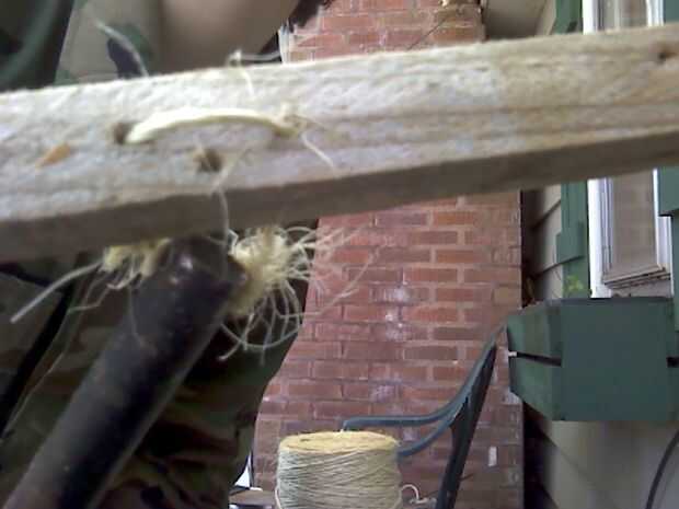 Tomar algunos cordeles y ejecutarlo a través de los agujeros en el polo y la madera y atar nudos en los extremos.