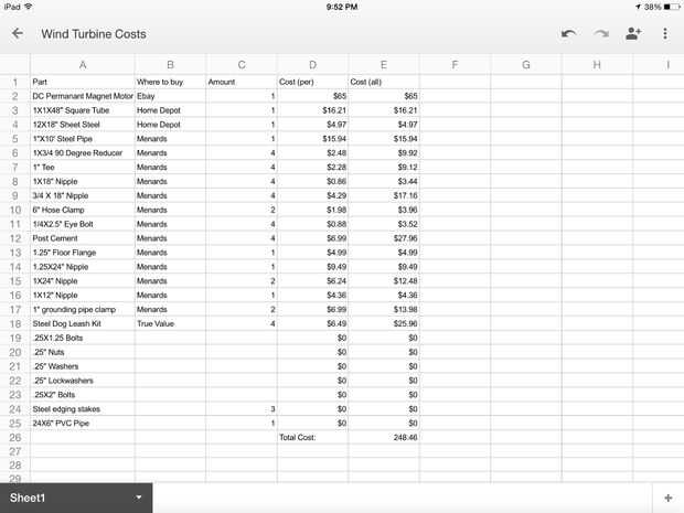 La imagen de arriba es una hoja de cálculo de todas las partes que utiliza al construir la turbina de viento sí mismo.