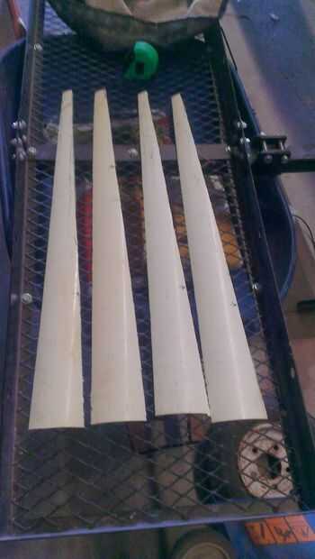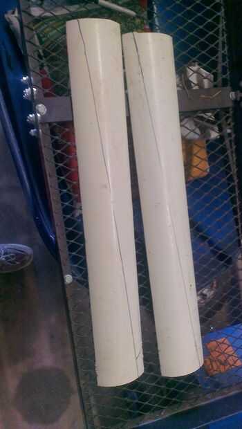 En lugar de gastar cientos de dólares en las láminas de mi aerogenerador, me hice mis propias hojas de scrap de PVC que tenía por ahí. Todo el mundo ahi dice usar PVC de 8" para las láminas de turbina de viento, y déjenme decirles, funciona mucho mejor que la 6" era capaz de conseguir. Tenía que ser creativo para hacer el trabajo de PVC de 6"(menor curvatura que 8").