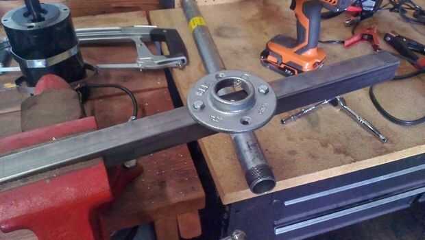 Una vez hecho todo esto, se enroscará un 1.25" diámetro niple en la brida. Utilicé uno que es 24" de largo, pero desea estar bien con 18" o quizás hasta 12". Esto se deslice hacia abajo sobre el poste principal que es 1" de diámetro.