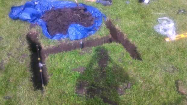 Había vertido de cemento alrededor de los cinco de las tuberías verticales y poner tierra encima y alrededor del resto. Puede haber formas más eficientes de hacer una base para esto, pero yo no quería correr ningún riesgo más.