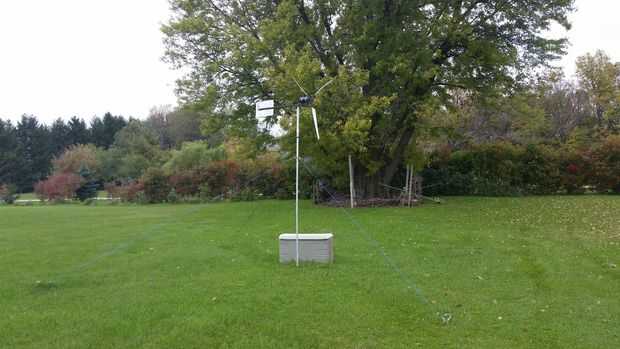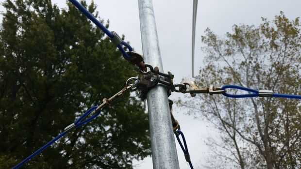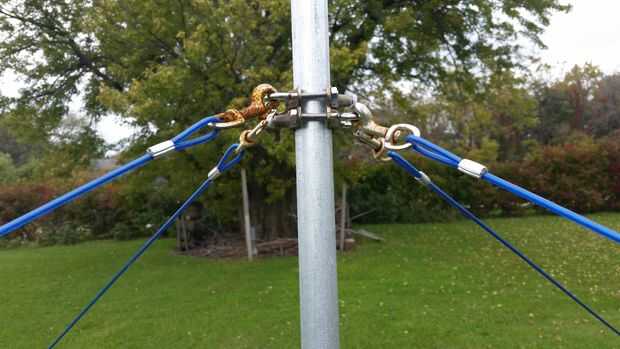 Para los alambres de individuo, inicialmente usaba paracord de alta resistencia, pero quebró en fuertes vientos, por lo que la transición al uso de correas para perros de trabajo pesado hechos de cable de acero trenzado que viene con estacas de rosca muy robusta. Les até al poste principal con dos abrazaderas de puesta a tierra. Vinieron las abrazaderas con pernos y reemplacé estos pernos con tornillos que los alambres de individuo podrían fácilmente clip a.
