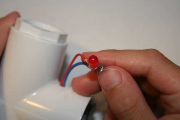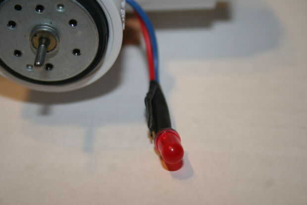 No realmente no soldadura tu LED. Simplemente enrolle los cables alrededor de las patas del LED. Largo corto y positivo pierna negativo. Cuando la forma de un motor de giro se encenderá el LED pero girándola al revés costumbre. Asegúrese de que las cuchillas que pones en están girando el motor en la dirección correcta. Si no, simplemente cambiar las patas del LED. Asegúrese de que prueba antes de pegar el LED en su lugar.