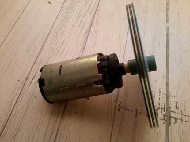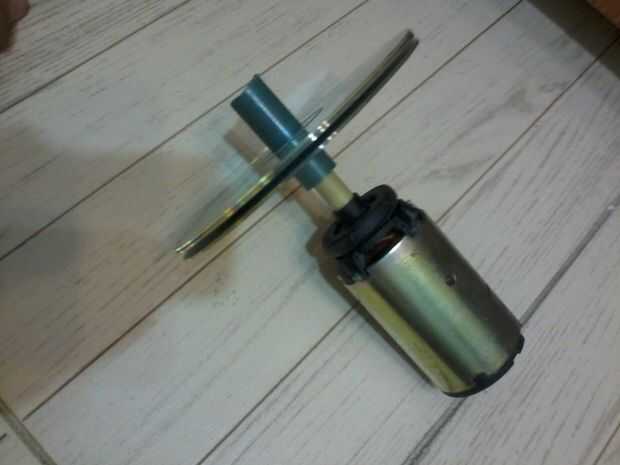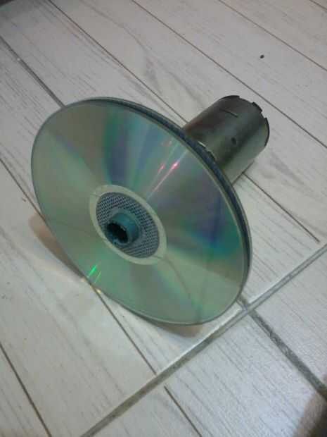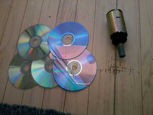 CDroms y DVDs alrededor de la tubería de plástico y el eje del motor.