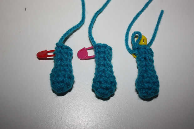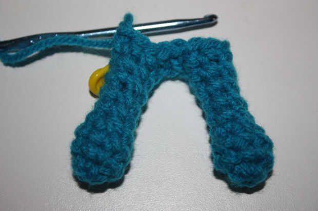 9 RND: Sc 3 en dedo C. Ch 2. Sostenga el dedo al lado de su trabajo y sc 6 dedo A. Sc 2 en la cadena. SC 3 en dedo C. (14 y 2 ch)