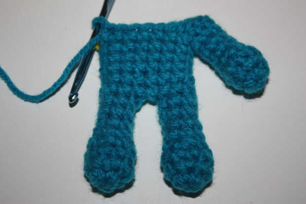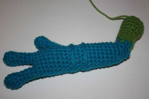 Usando el hilado azul, sl st 9 en un círculo en el brazo para formar el codo y comenzar la parte superior del brazo. (ver foto de ubicación)