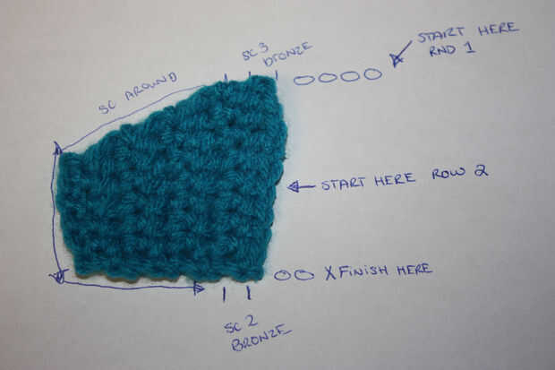 Usando hilo de bronce, ch 4. SC en la marcada San Sc 2. SW a verde. SC a lo largo de la parte superior de la fila 8, sc por el lado de las filas, sc a lo largo de la ch de principio hasta que tenga 2 sts izquierda. SW para bronce, sc 2, ch 2. F