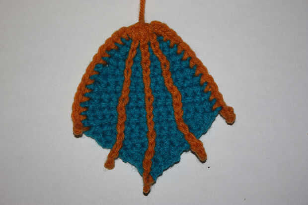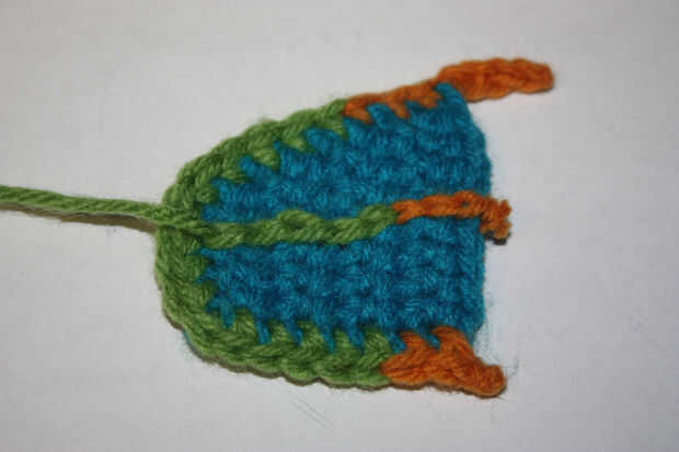 Va a comenzar la última línea de los detalles de la aleta en el centro del borde azul hacia el borde verde. Conecte el hilo de bronce en el borde azul. SL st 2. SW a verde. SL st hasta el borde verde.