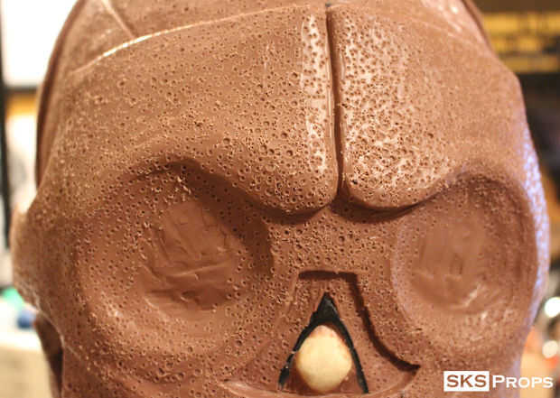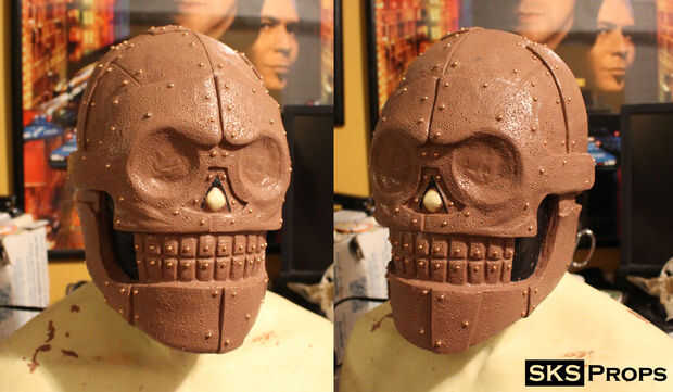 Una vez la máscara Turbo Kid Skeletron alisada y escalada para caber yo comenzar a añadir los detalles. Para las chapas me lanzó algún monstruo de arcilla en un espesor uniforme y había recortado con un cuchillo. Los lados son redondeados para dar más de una sensación orgánica. Para hacer todos los hoyos y hendiduras en el metal que pasé bastante tiempo punteado la máscara con varios lápices, tacos y cepillos de alambre. Tomó para siempre pero tengo la textura que quería. Después de los pozos de uso una pistola de calor y derretir muy cuidadosamente la arcilla un poco. Siendo consciente que no exagere y fundir parte de su rostro. Los "remaches" son hechos por hundimiento municiones de cobre en la arcilla.
