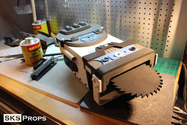 La hoja de sierra corte de 5 mm de espuma de arte espeso y conectada a un ventilador pequeño con un paquete de pasta. Si el disco gira!!! Mi hija tenía un golpe pequeño castillo que fue utilizado para un pedazo de centro en su fiesta de cumpleaños. Después de la fiesta decidí que se convierte en sangre dejar de hilar de la muerte. Lamentablemente corrompido de las fotos que tomé del proceso de conversión pero voy a probar y explicarlo. Así que desmontar la parte superior de la caja del ventilador y usa una Dremel para perfil todas las protuberancias que celebran juntos. De esa manera la hoja girar libre de obstrucción. Pegué la lámina de espuma directamente a la parte superior del ventilador y debido al peso ligero de las hojas, apenas redujo a la rpm. La parte inferior del ventilador fue atada a un bloque de espuma y pegada al interior pared y mango del arma. La batería del AA fue instalada en el interior utilizando comercial grado velcro por lo que podría ser tomado hacia fuera cuando las baterías deben reemplazarse.
