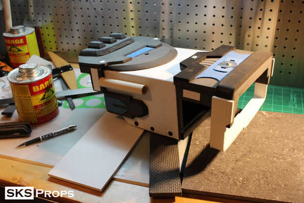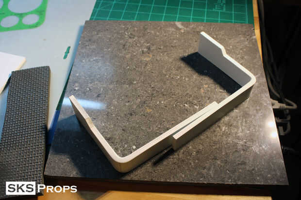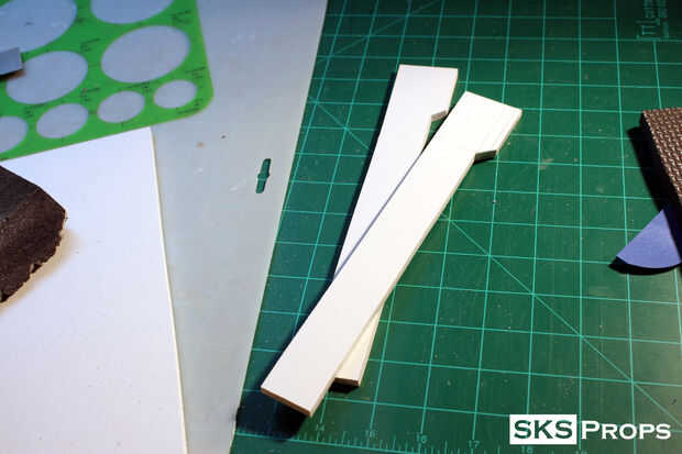 El arma tiene un mango que agarra en posición la sierra. Sabía que la espuma no resistir el desgaste por lo que cortar unas tiras de 1/4" estireno para simular la manija. El estireno es lo suficientemente gruesa como para tener cierta durabilidad pero todavía muy ligero. Usando una pistola de calor era capaz de doblar el estireno a la forma y el contorno y pega las piezas con Loctite superglue de grado profesional.