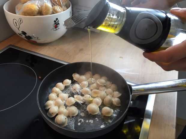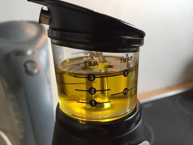 Levante la tapa e inmediatamente vierta unas gotas de aceite en ella, he usado cerca de un tercio de lo que está en la foto en la taza de medición.
