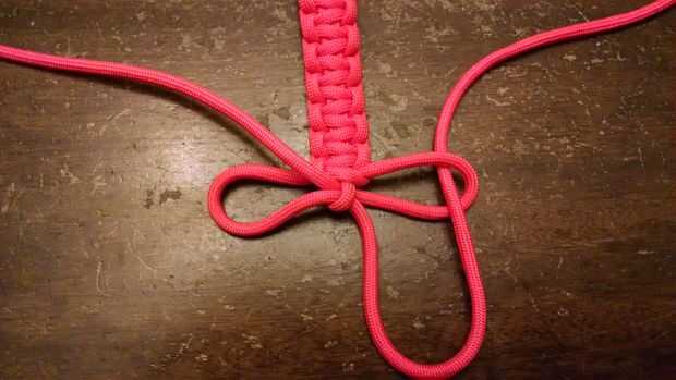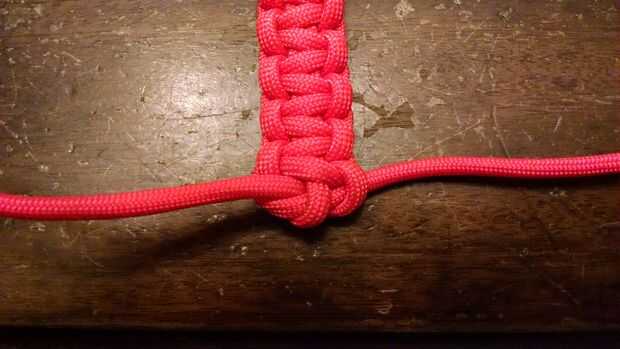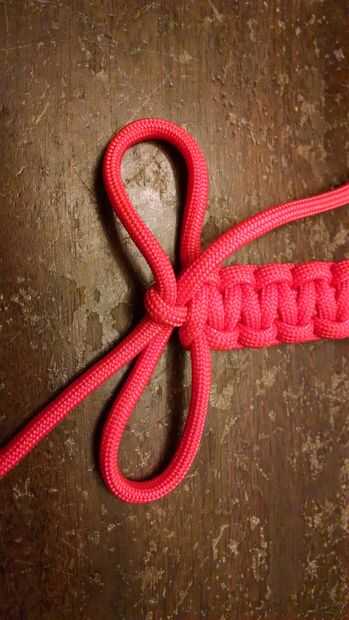-Cuando se consigue hasta el bucle de centro ambos trabajando extremos necesitan pasar a través del lazo del centro. El trabajo final que ha pasado hacia adelante y hacia atrás a través del frente de la obra debe ir a través y hacia abajo a través del lazo. El extremo de trabajo que fue hacia adelante y hacia atrás a través de la parte posterior de la obra debe ir a través y hacia arriba a través del lazo.