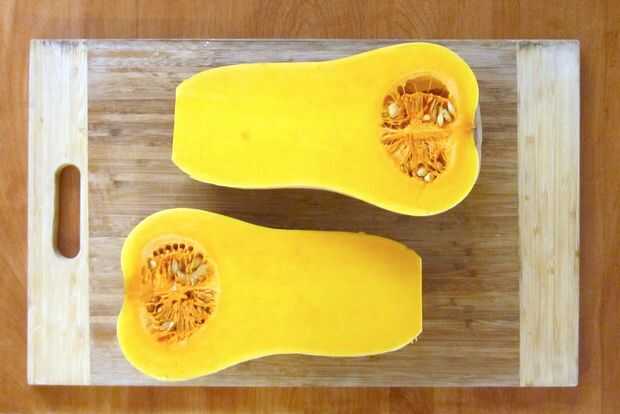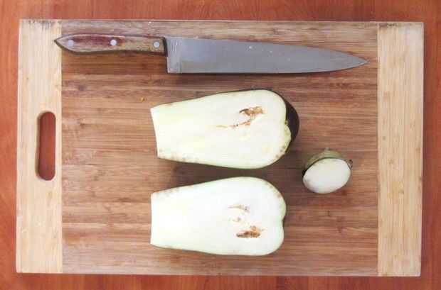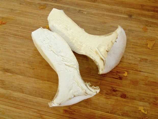 Ahora, con un gran cuchillo afilado corte la parte superior de la calabaza y luego córtalo por la mitad longitudinalmente. Repita con la seta de ostra rey y berenjena.