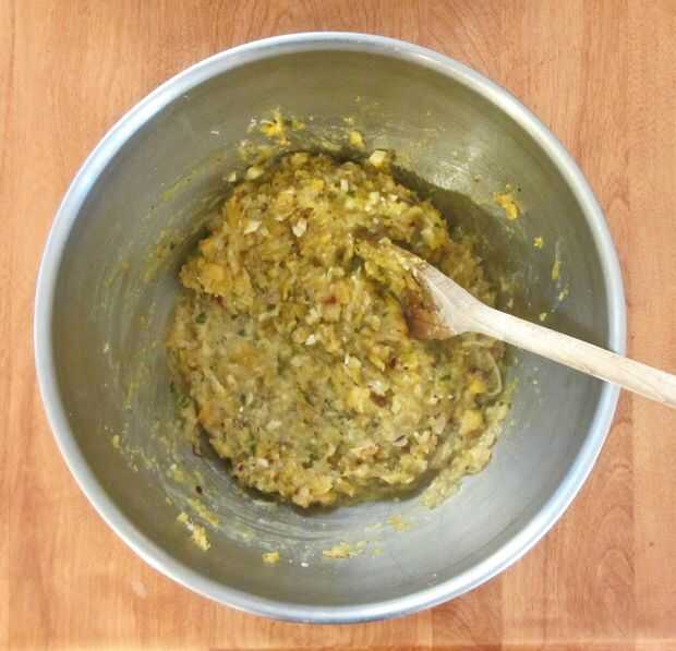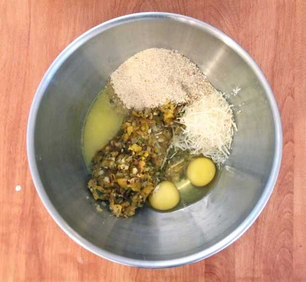 Añadir dos huevos, el pan rallado, mantequilla derretida y el queso parmesano a su tazón de fuente. Mezclar bien con una cuchara de madera o las manos. Si vas a usar tus manos, tenga cuidado y espere hasta que la mezcla de relleno se ha enfriado.
