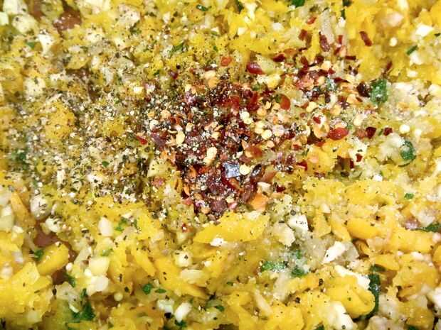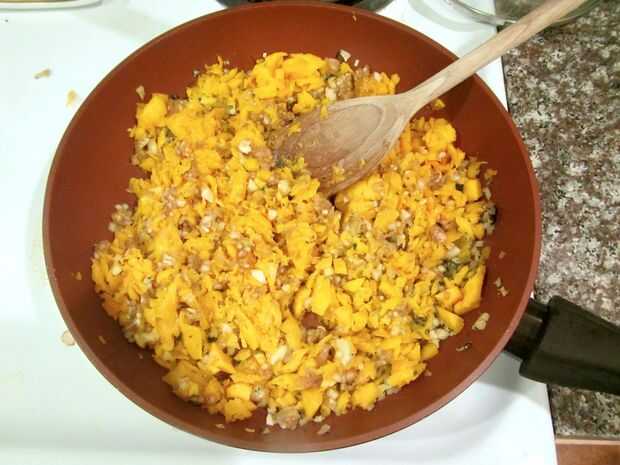 Vierta aproximadamente una cucharada de aceite en un fuego medio sobre la estufa. Permitir que el aceite a calentar y añadimos el ajo, chalotas y hierbas a la sartén caliente. Saltear por un minuto antes de añadir la berenjena picada encima de calabaza y champiñones de sobras. Cocinar medio durante unos 5 minutos permitir que algunos de la humedad de las verduras y se evaporan. Añadir tus copos de pimiento rojo, sal y poco de pimienta al gusto. Retire la cacerola del fuego y verter su contenido de relleno en un bol.