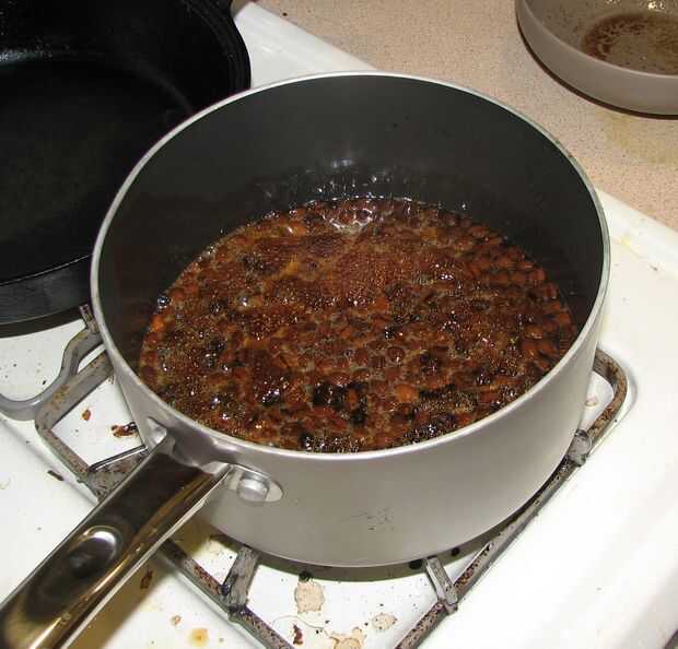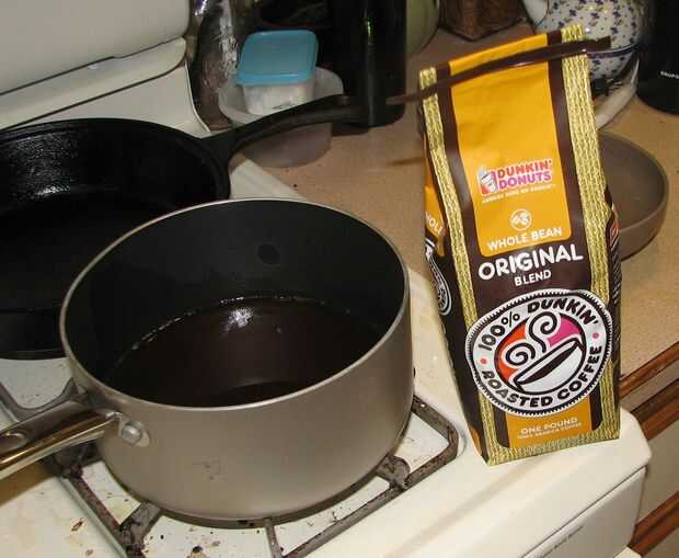 Para nuestro intento de salsa de café, se recogieron y filtran los goteos de la Turquía. Agregamos dos tazas de caldo de verduras y cuecen a fuego lento con 1/4 de taza de granos de café enteros. Después de no lograr un sabor de café después de 15 minutos, agregamos granos de café de 1/4 taza agrietada. Quince minutos de hervir más no producen resultados, así que hemos añadido dos tiros de espresso. Que también ha podido añadir un sabor de café a la salsa, así que usamos 2 cucharaditas finamente molido. El sabor fue de "salsa" a "café quemado". Tal vez estaba demasiado caliente y así que inmediatamente quemó el café en polvo.