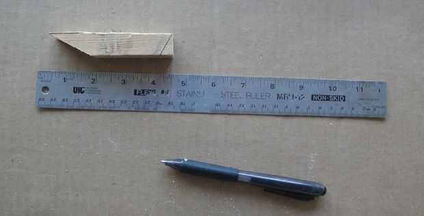 Tomar la pieza de 4 pulgadas de madera y colocar la marca de.75 pulgadas en la esquina sin cortar al otro lado de la otra. Gire la regla usando la marca de.75 pulgadas como el centro de rotación. Cuando la marca de 0 pulgadas alcance el lado del rectángulo de madera debe tener un triángulo. la marca y corte.