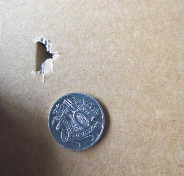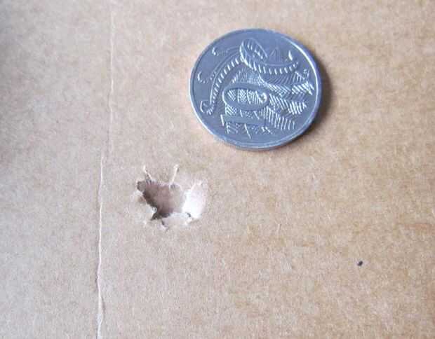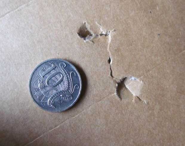 He utilizado un trozo de cartón para mostrar el impacto patern de todos tres platinas. Esta prueba no es perfecta no demuestra la penetración sino que demuestra bien que el bolo causó más daño luego la suma de sus partes. me encantaría ver lo que hace a balístico gelatina pero... no tengo ninguno