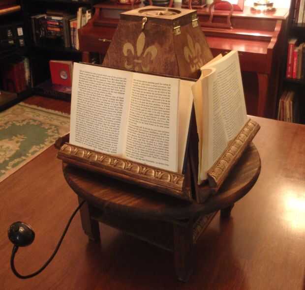 Esta es una pieza de conversación real para tener en una biblioteca o estudio, así como ser de uso original. Había leído sobre esto hace mucho tiempo y decidió crear uno después de que mi abuela tenía una lesión en el cuello y no podía mirar hacia abajo mientras que en un cuello Ortopédico. Funcionó muy bien y ha seguido siendo de uso después de que ella consiguiera mejor.