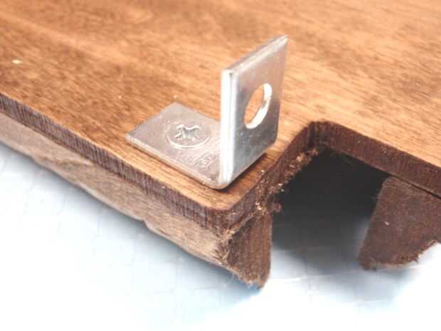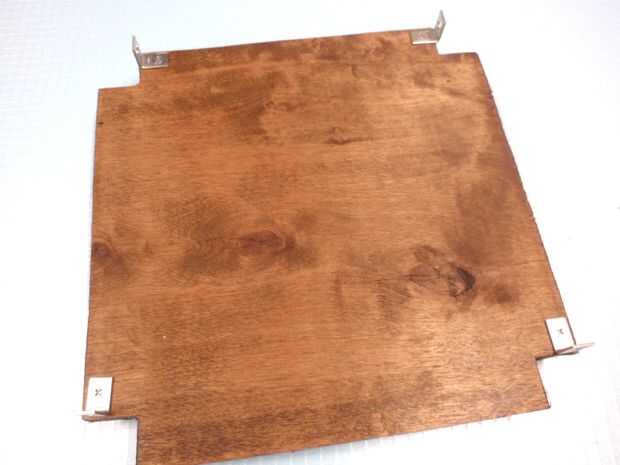 5. voltee el estante y fijar un soporte a cada esquina, mirando hacia la abertura para que eventualmente pueda enroscar en las patas de la base. Los tornillos que vienen con los soportes será demasiado largos para el 1/4" madera contrachapada, pero si les coloca correctamente la longitud adicional entrará la moldura en el otro lado y no mostrar. Ver foto.