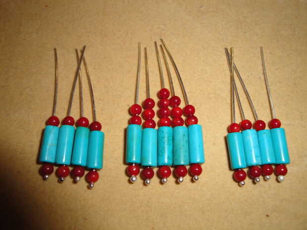 Disposición primera, sus perlas y alfileres de cabeza. Puedes seguir mi diseño abajo o crear los suyos propios. Puse 4 alfileres de cabeza en cada lado con un patrón rojo-turquesa-rojo, así que es 8 en total con ese patrón. El mediados 5 pernos de cabeza seguí añadiendo cuentas de coral en la parte superior lo que había una ligera pendiente, que cuando añadido con la ladera de la cadena hace un patrón de chevron muy agradable.