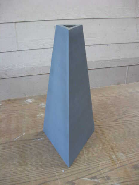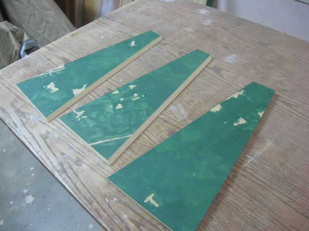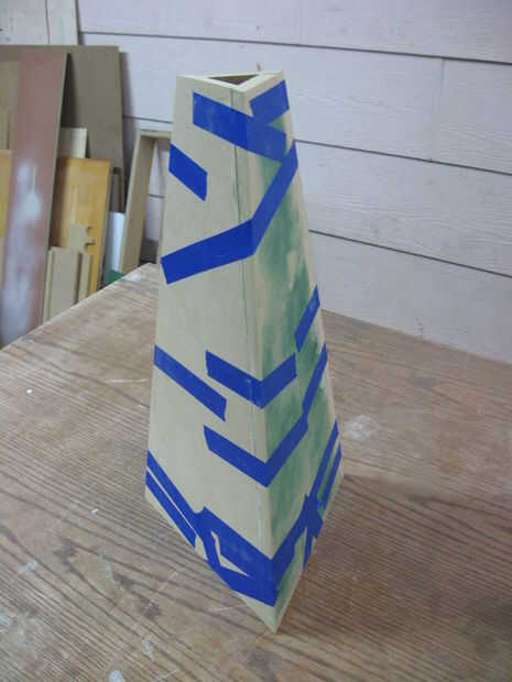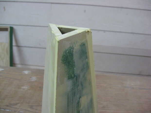 Los lados se pegan, y una pieza triangular de MDF fue pegada en la parte inferior de la base. Relleno de madera se utilizó para limpiar las costuras. La base fue luego pintada con imprimación.
