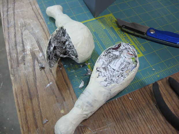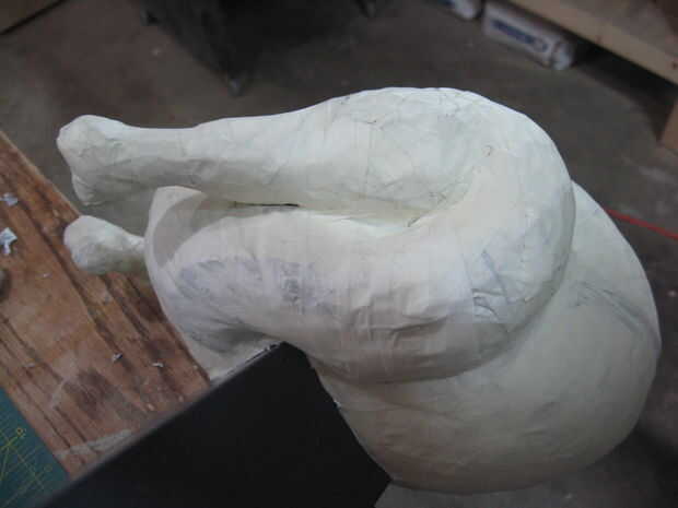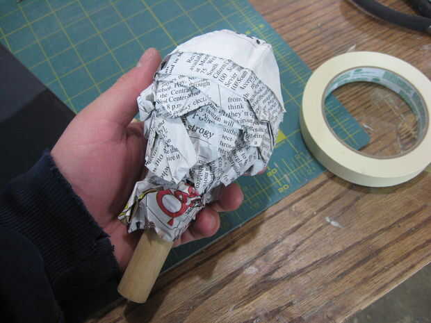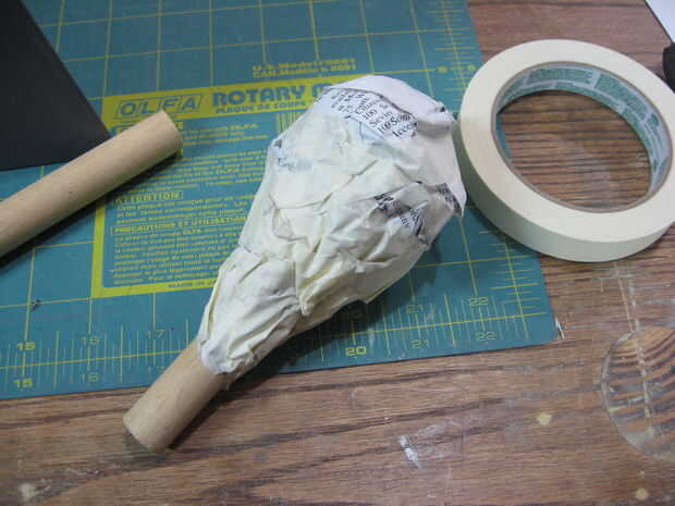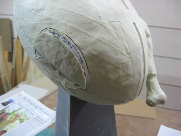 Más periódico y la cinta fueron añadidos y forma hasta que estuve satisfecho. Los lados de los muslos se cortaron planos, junto con un punto en el lado del fútbol. Las baquetas se pegan y reforzadas con cinta de enmascarar más.