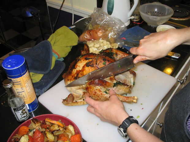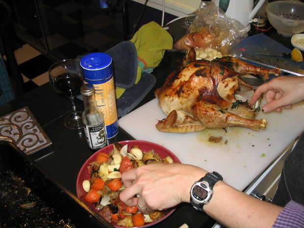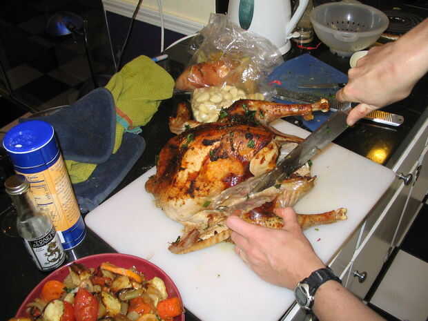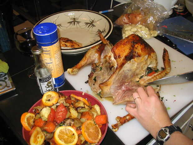 Quitar todas las verduras asadas en una fuente de servir, drenaje y reserva de jugos para su uso en salsa y tallar el pavo. Encontrar una tabla de cortar grande y un cuchillo fuerte y agradable.