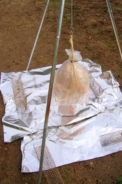 -Trípode de metal (la que se muestra es un campamento cocina trípode que viene con una rejilla metálica redonda que se ajusta hacia arriba y hacia abajo. Se han eliminado de la parrilla y 3 cadenas laterales.