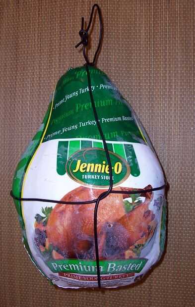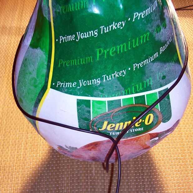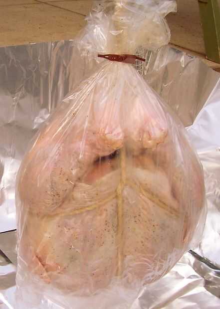 7 . Después de que el trabajo de cuerda es Coloque el pavo en la bolsa de horno y ligadura en la parte superior.