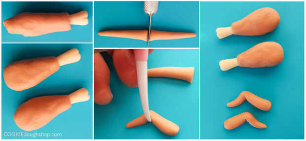 Cada hueso con un pedazo de "Piel" del rodillo fondant, usted puede necesitar un poco de "pegamento" (= jarabe de maíz de 50% + 50% de agua o utilizando un gel de tubería preparada, o hacer un pegamento de goma mezclando polvo tylose con una pequeña cantidad de agua).