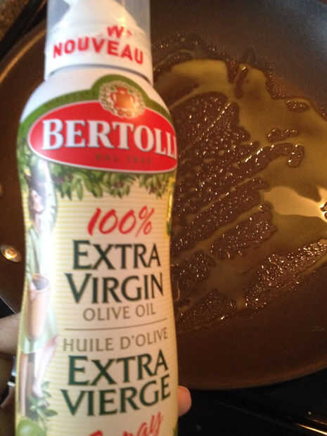 Rocíe la sartén antiadherente con aceite de oliva, encienda la estufa