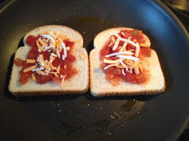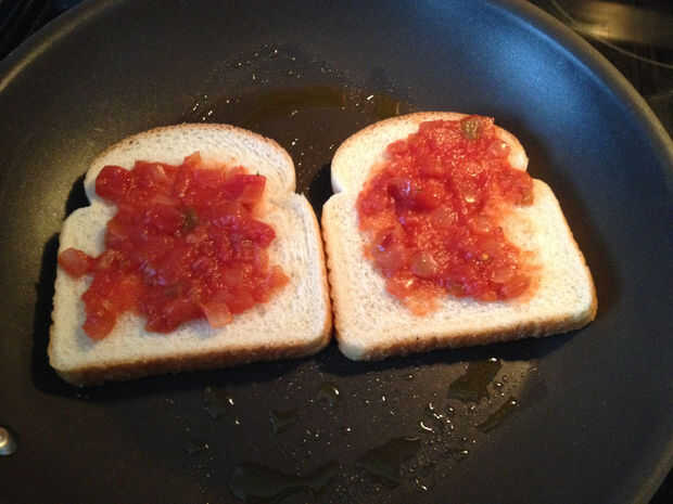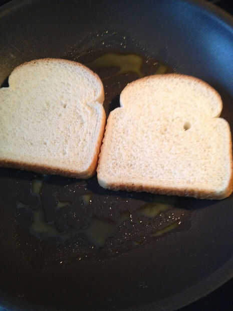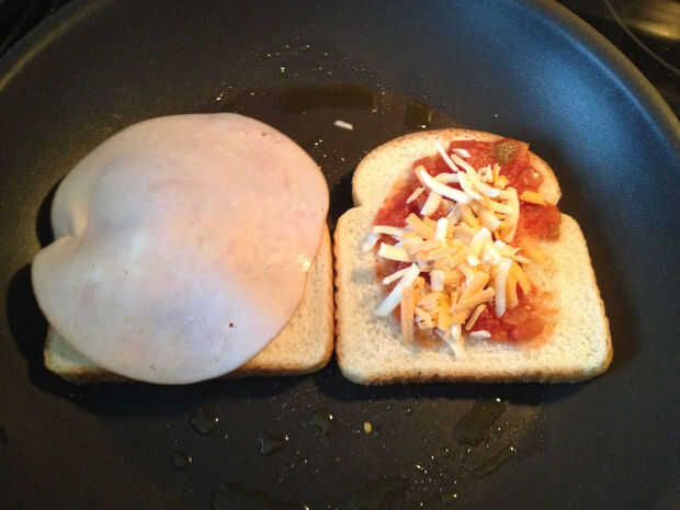 Y en uno del pan, una carne, freír hasta que el pan se está dorando, sandwich, servir