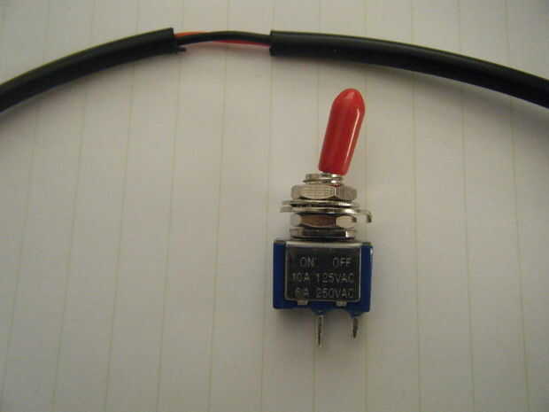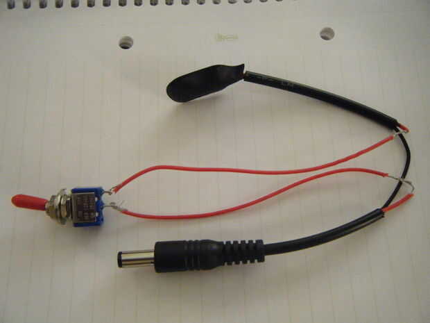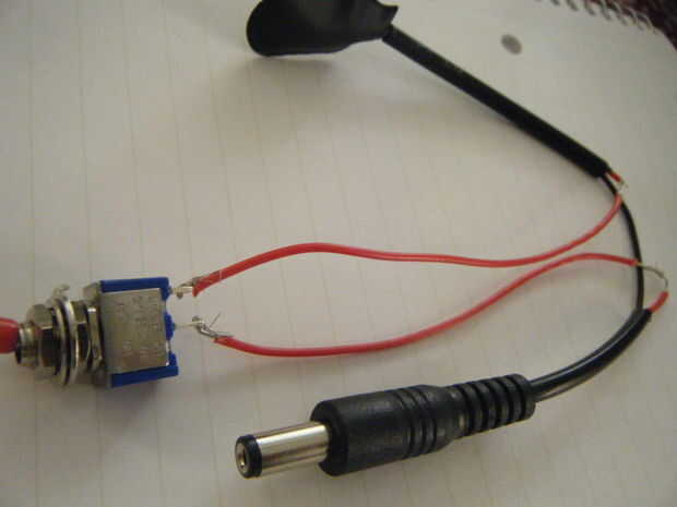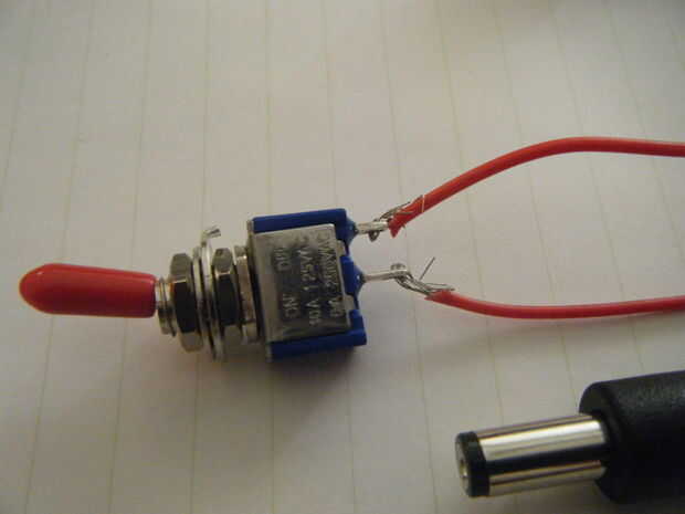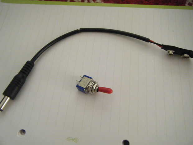 Ahora agarra el interruptor SPST y un 8" pulgadas cable a cada terminal de la soldadura. Tome a la clavija de enchufe de 9v y corta el cable rojo a la mitad, luego soldar un cable desde el interruptor a un extremo de la clavija de enchufe y el otro cable del interruptor al otro extremo del gato plu.