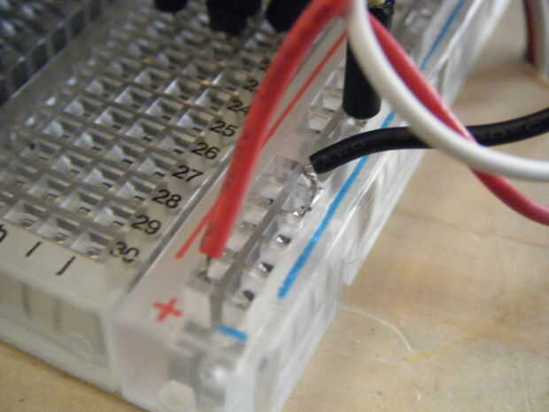 Conecte el cable marrón al riel azul de la placa y el cable anaranjado al cable rojo de la placa.
