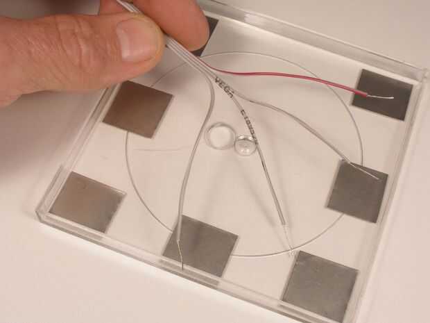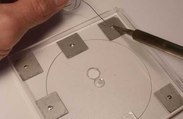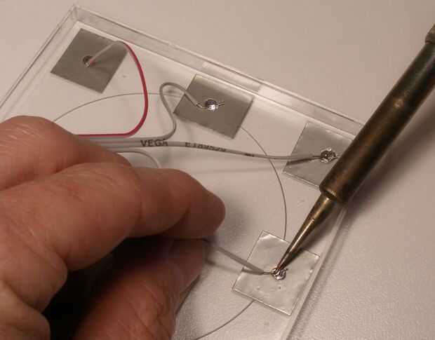 Ahora calentar el soldador! Derrita una pequeña gota de estaño en el medio de su clave de la cinta de cobre. Asegúrese de hacer esto rápidamente y mantener la plancha se enfríe, si se puede controlar la temperatura, para que no derrita la tapa de plástico!