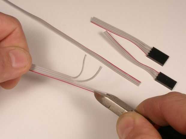 Cortar aproximadamente 2" de los cables de puenteo que venía en el kit. [Enlace al tutorial de diseño clave que no involucra corte tus jumpers próximamente aquí]. Cortar entre los conductores en el cable de cinta y pelarlas para que pueden alcanzar las teclas que desea conectarse. No tire de los cables hacia fuera demasiado lejos! Si tienes un montón de hilos de spaghetti caja y recibir señales de loco! Usted puede encontrar que uno o más de los cables termina siendo largo para la conexión que desea hacer (ver última foto abajo). Es mejor cortar a la longitud correcta, para que no te señales no deseadas desde el sensor.