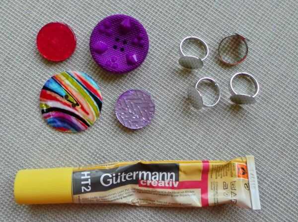 Esta divertida, colorida idea para los anillos de botón blinged arriba cruza dos proyectos encontradas Página Web de Joann: anillos de botón cubierto y botones y collar Bling.Paso 1: materialesAquí es lo que necesita hace estos lindos anillos con mot