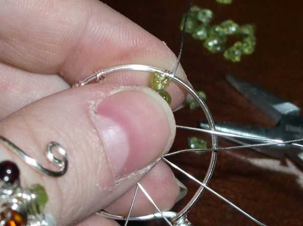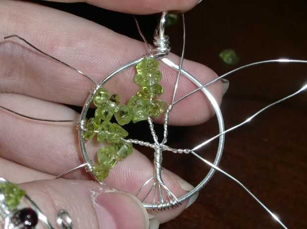 a partir de la primera rama, añadir las virutas de piedra o perlas al alambre de 26g. Una vez que hayas añadido los granos a la rama, tome el cable de 26g y envolver firmemente alrededor de la estructura de 18g 3 - 4 veces; no cortar el cable sobrante aún. Repita para cada rama hasta que todos ellos tienen hojas.