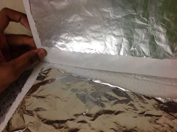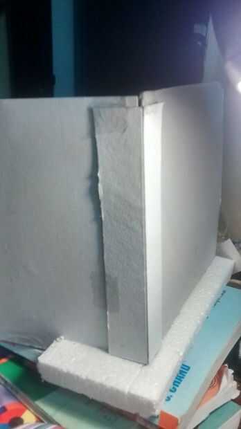 Necesitamos tres pedazos separados de papel de aluminio, con dimensiones de aproximadamente 8 * 8 pulgadas. Un pedazo de papel se pega en una gruesa base de Styrofoam(thermocol). Ranuras se realizan en la espuma de poliestireno en 2 lados adyacentes de la hoja, como se muestra en las fotos de arriba.