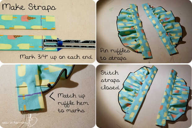 Sandwich el borde se reunieron las piezas volantes entre las piezas de correa y pasador. Asegúrese de que el dobladillo de la colmena coincida con las marcas.