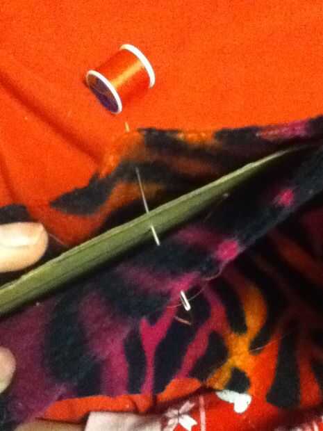Pase la aguja, luego empezar a coser! Cose a través de la cartulina. No recomiendo usar una máquina de coser para esto. Mantener en coser hasta que regreses al principio. Nudo inicial y final juntas. Cortar a la tela sobrante.