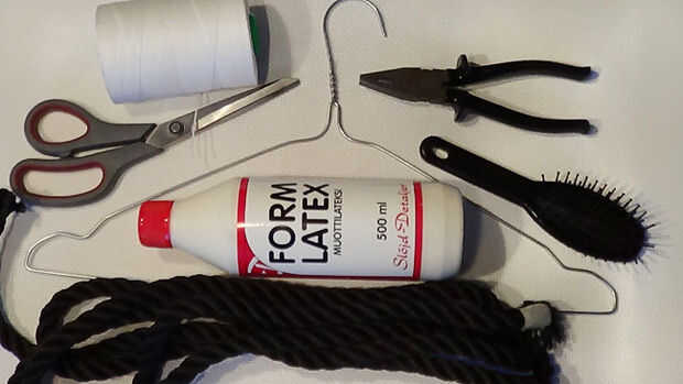 Lo que necesita es un gancho de ropa en metal, tijera, látex leche, un trozo de cuerda de unos tres pies de largo, hilo resistente o cuerda (yo usé hilo para trabajo del cuero), un cepillo y un par de alicates para cortar su colgador de ropa con. Y por supuesto, pelo.