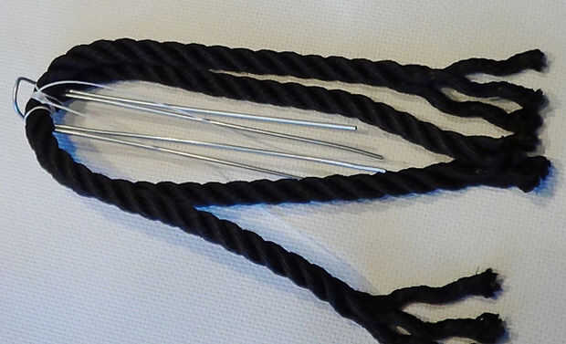 Utilice el cable de hilo para atar los pedazos del metal juntos, bucles separados y alejados uno del otro. Fijar las piezas de dos cuerda, uno a cada lado de los soportes metálicos, con el hilo.