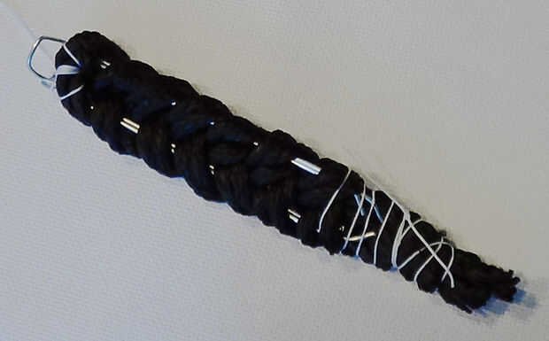 Soltar la cuerda girando hasta que cada longitud de la cuerda se ha convertido en dos partes. Reunir en tres grupos y empezar a trenzarles alrededor de las piezas de metal, por lo que usted realmente la trenza el metal en la cuerda como una base estabilizadora. Unir las puntas firmemente en el extremo. Se trata de la raíz de su cola, que atar o coser, el cabello en.