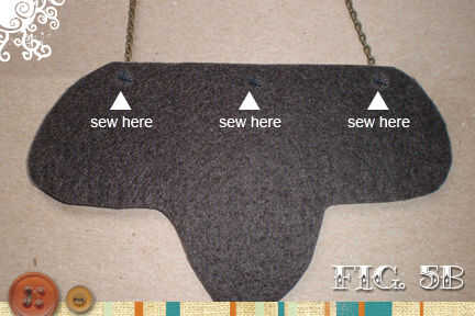 Tomar la cadena y colocar el centro medio alineado con el centro del fieltro (véase 5A). Coser la cadena en su lugar. A continuación tomar la cadena y hacia un lado de la esquina superior izquierda y coser en su lugar, repita con el lado derecho (fig. 5b).